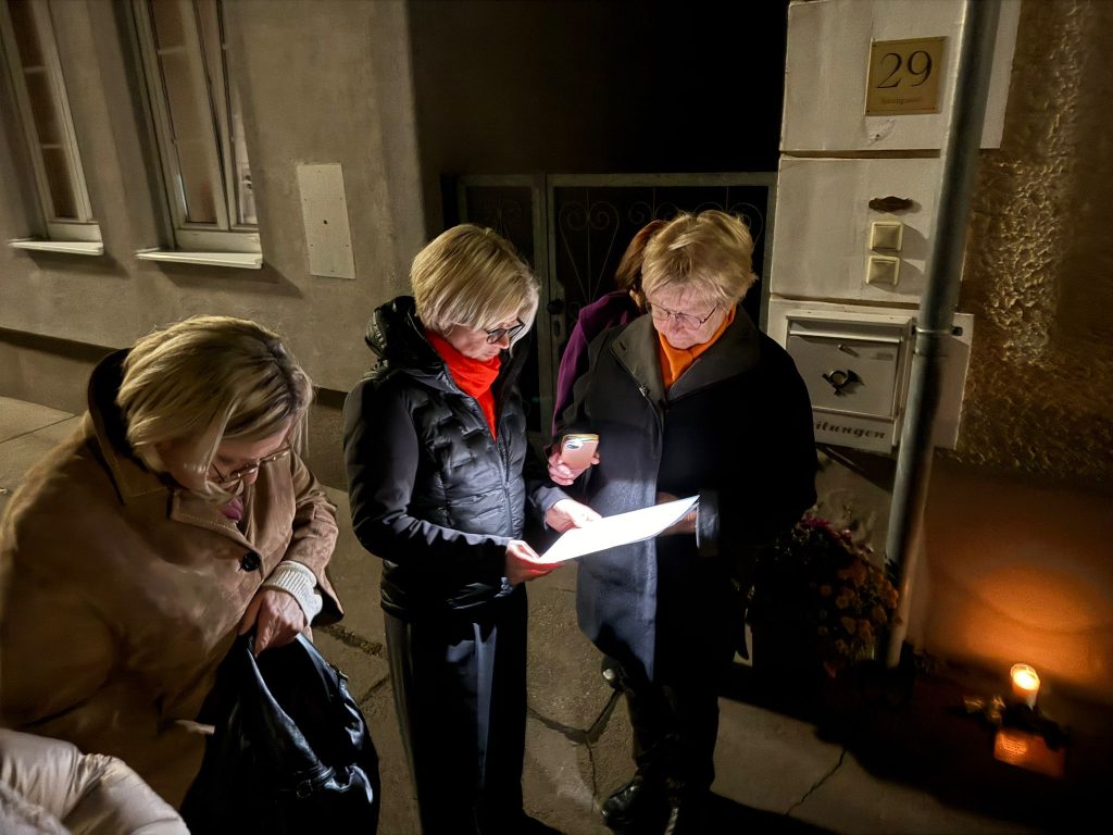 Gestiftet wurde dieser Stein der Erinnerung von Fam. Dorothea und Johann Bruckner im Jahre 2019. Auch sie waren bei der Gedenkfeier anwesend und erzählen über die Beweggründe, sich gerade für diesen Stein zu entscheiden: Das Ehepaar hat sich in der Bachgasse kennengelernt und hat – wie auch die deportierte Mutter – ebenfalls drei Töchter.